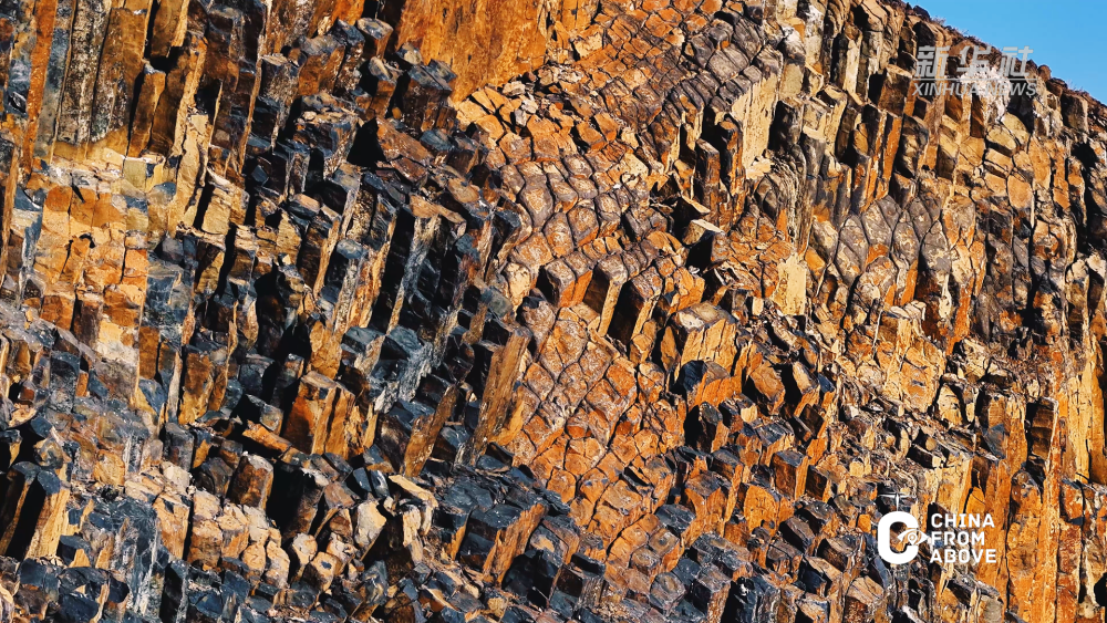 山體裸露的巖層呈現(xiàn)出罕見的同心放射狀柱狀節(jié)理,黑色玄武巖整齊排列,宛如巍峨城墻。巖柱紋理清晰、氣勢恢宏,完整記錄了遠(yuǎn)古火山運動的地質(zhì)變遷。